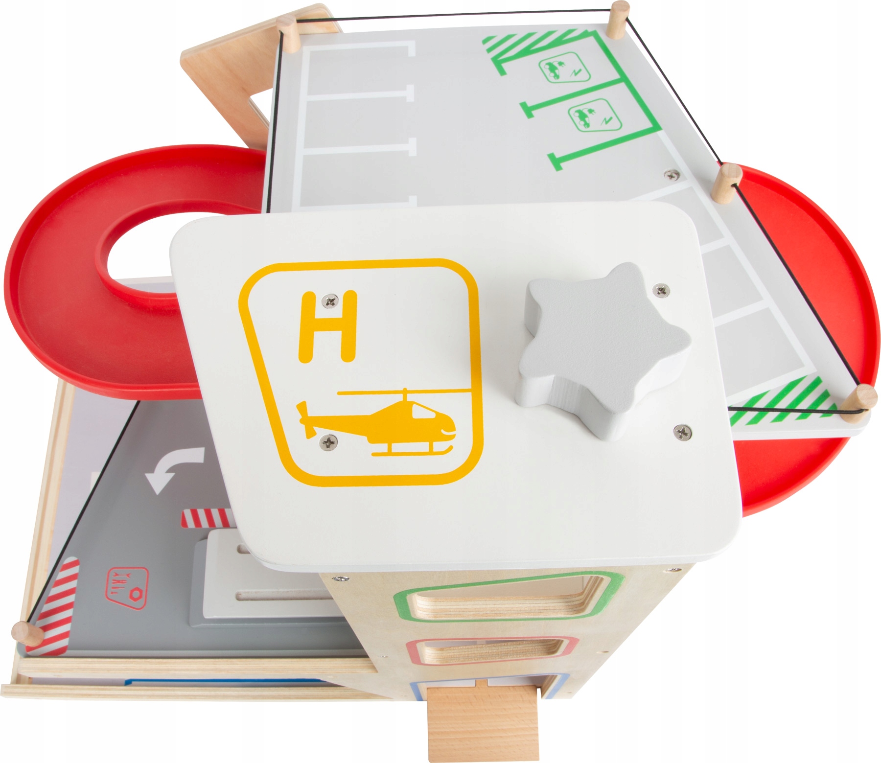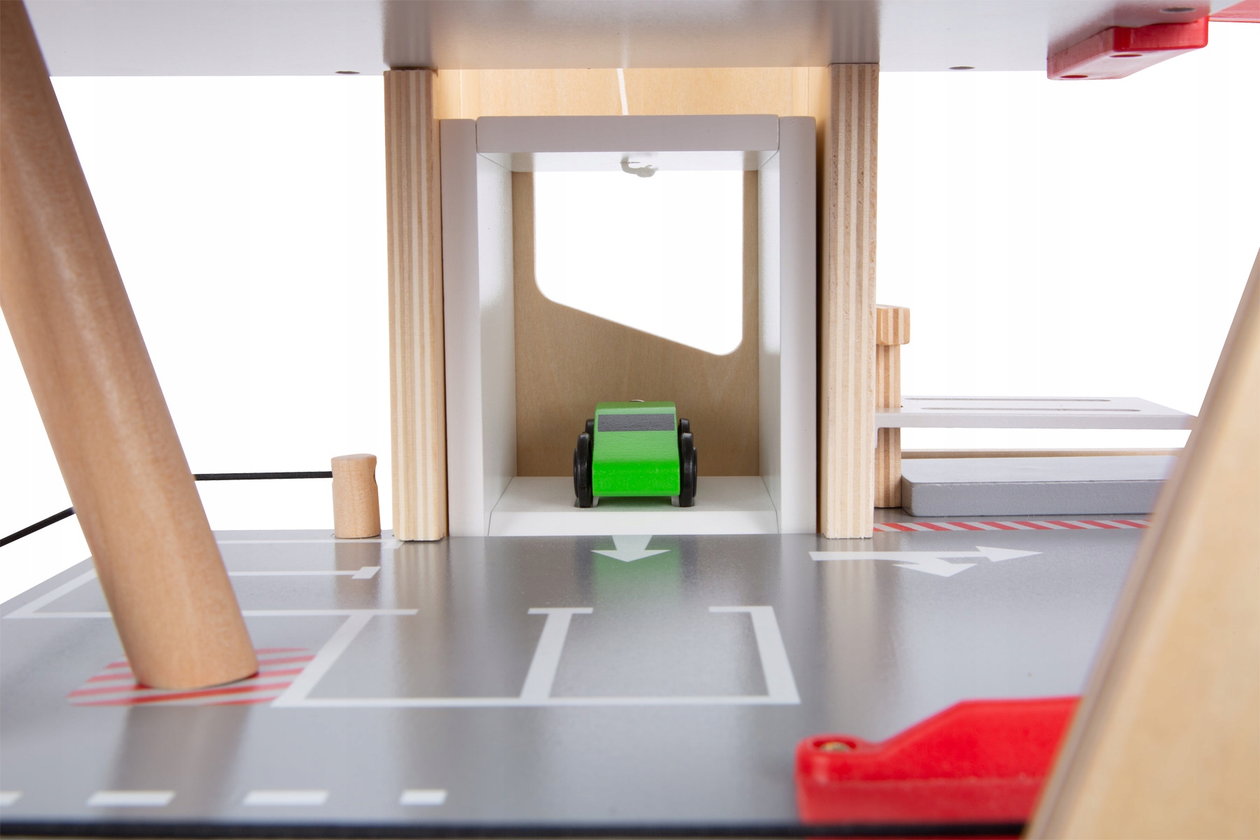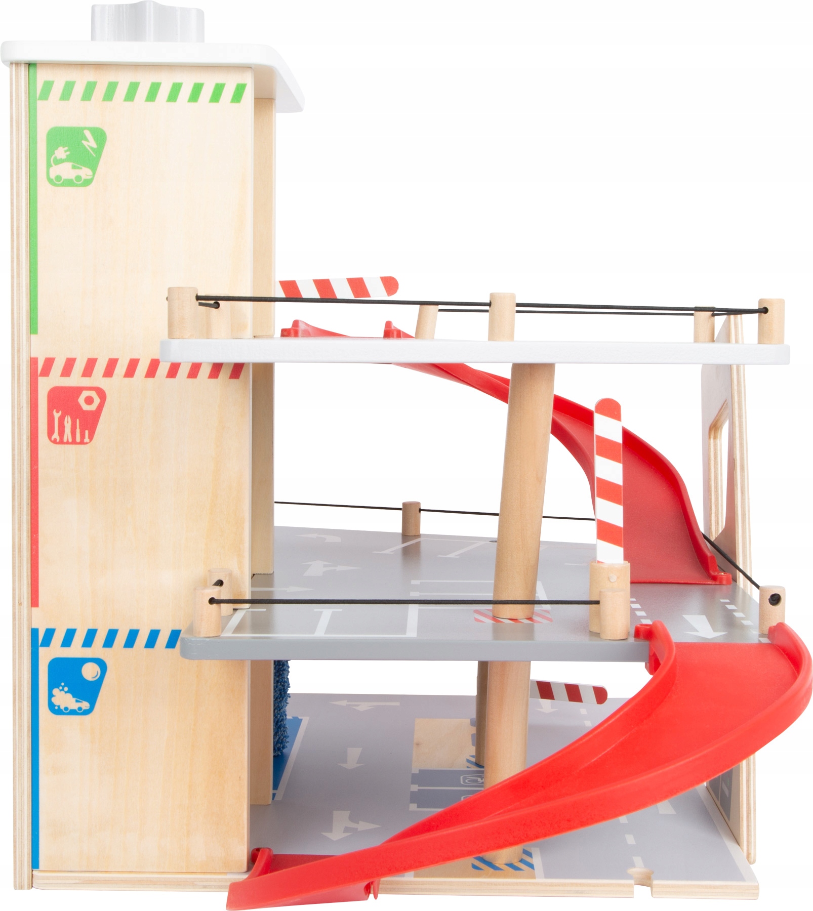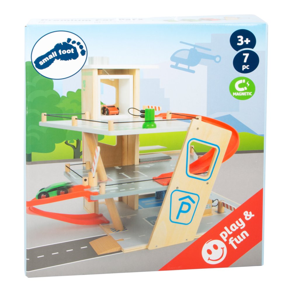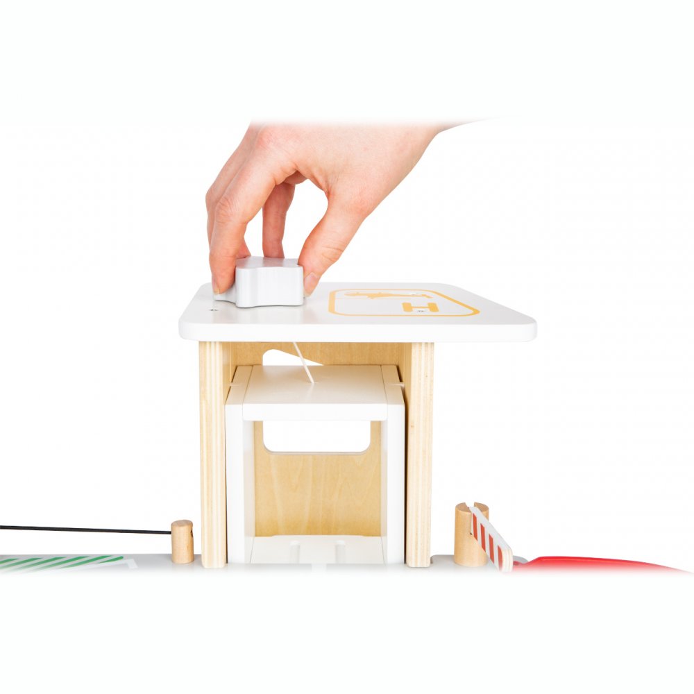 Parking, tankowanie, mycie, naprawa- jeden parking, wiele możliwości! Dwa dołączone samochodziki można zaparkować na trzech różnych poziomach w tym garażu lub za jednym zamachem zjechać po rampach. Podnośnik samochodowy, sterowany ręczną korbą, przenosi pojazdy na różne poziomy parkingu. Mechanizm blokujący i rowki w podłodze zapewniają, że samochody wjeżdżają na wszystkie poziomy bez poślizgu. Elastyczny gumowy ogranicznik sprawdza się również jako świetna katapulta do autka. Lądowisko dla helikopterów na dachu windy dopełnia zabawę! To absolutny must-have dla młodych fanów parkingów i garaży, a także prawdziwe wzbogacenie floty autek w przedszkolu! Dwie stabilne rampy z tworzywa sztucznego są ustawione w taki sposób, że możliwy jest jeden ciągły wyjazd. Przez cały czas szlabany na zawiasach mogą służyć do kontroli ruchu. Ten zestaw gwarantuje wysoką wartość czasu gry i długotrwałą zabawę! Ten garaż urzeka klientów swoim dobrze widocznym drewnem i typowymi kolorami występującymi w ruchu ulicznym. Ponieważ projekt nie zawiera liczb i słów, nawet najmłodsze dzieci mogą zrozumieć ikony i ilustracje. Unikalna architektura zapewnia dużą stabilność.