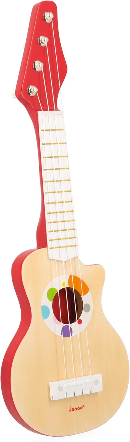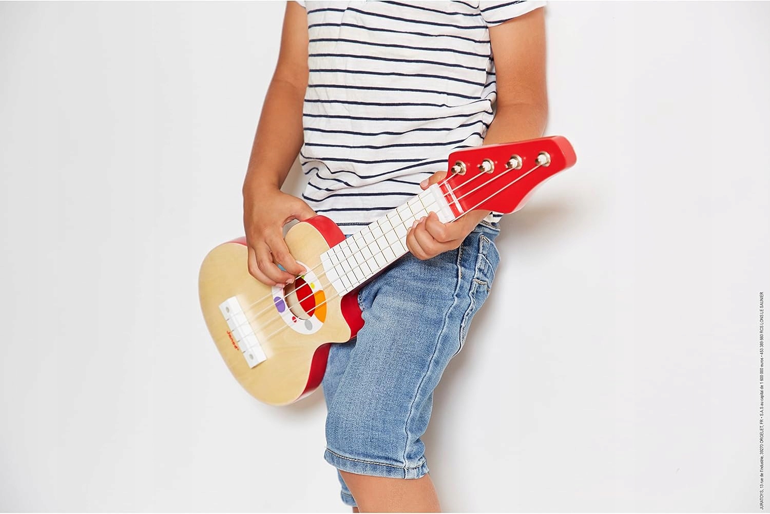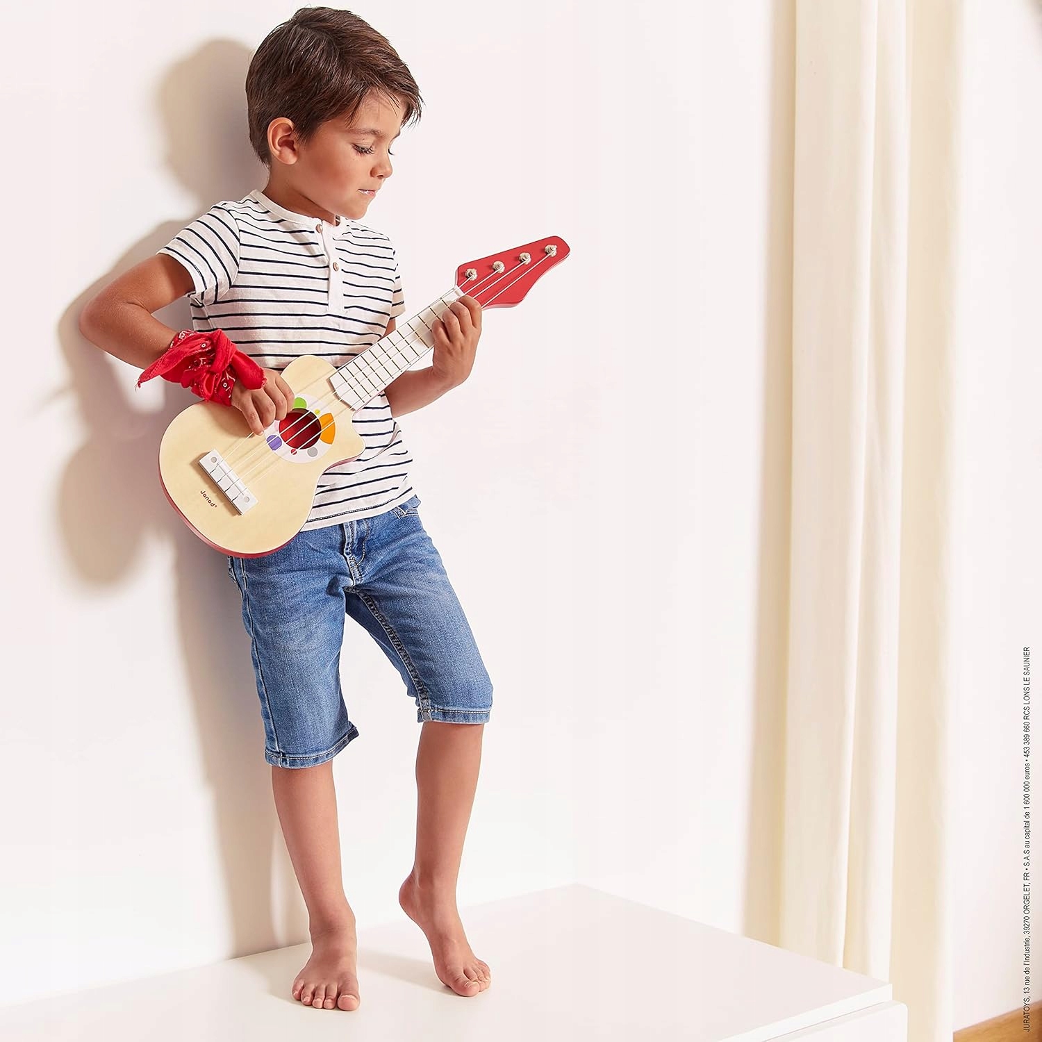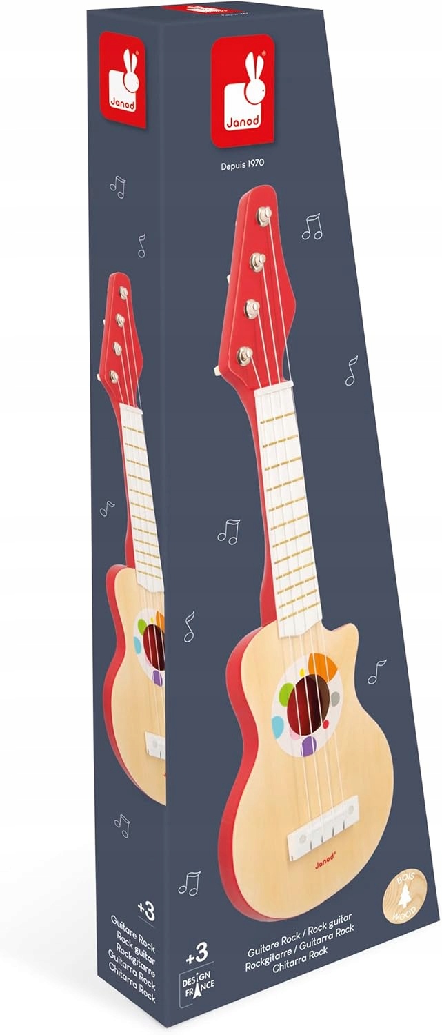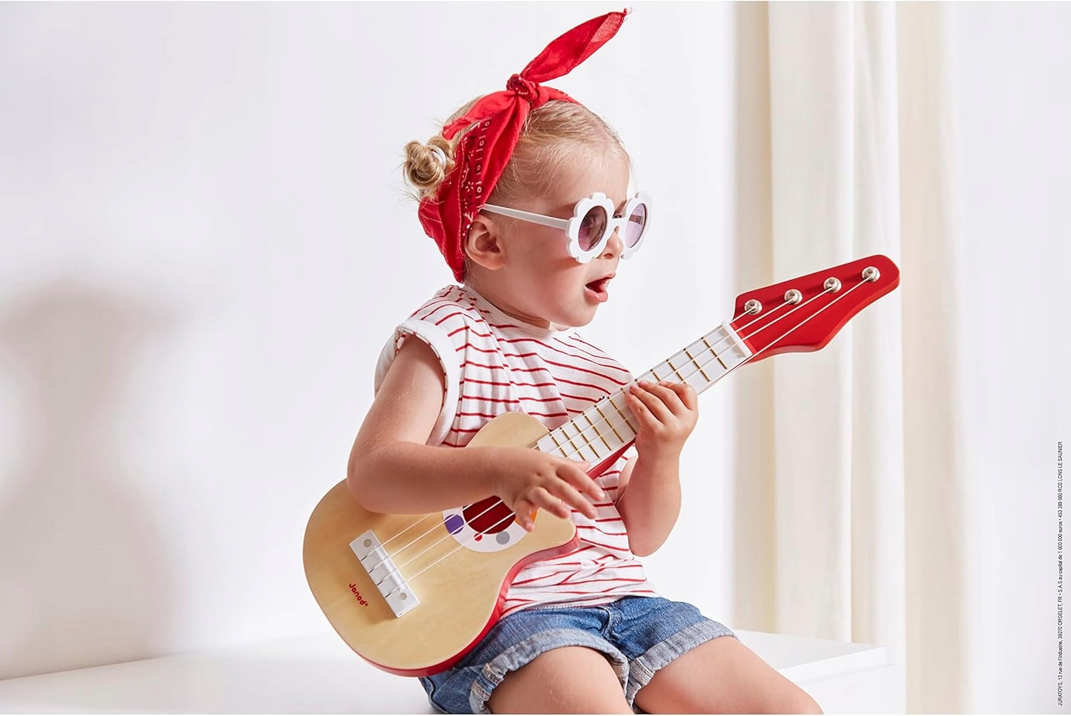 Gitara rockowa z serii Confetti francuskiej marki JANOD to idealna pierwsza zabawka muzyczna dla dziecka, która pomaga rozwijać słuch, poczucie rytmu oraz zdolności muzyczne. Wspiera także rozwój wyobraźni, koncentracji, wytrwałości i koordynacji ruchowej. Gitara ma 4 struny, których napięcie można regulować pokrętłami, klasyczny rockowy kształt ze stosunkowo płaskim pudlem i przyjemne brzmienie. Wyróżnia ją piękna kolorystyka: naturalne drewno, czerwień, biel i kolorowe kółka.