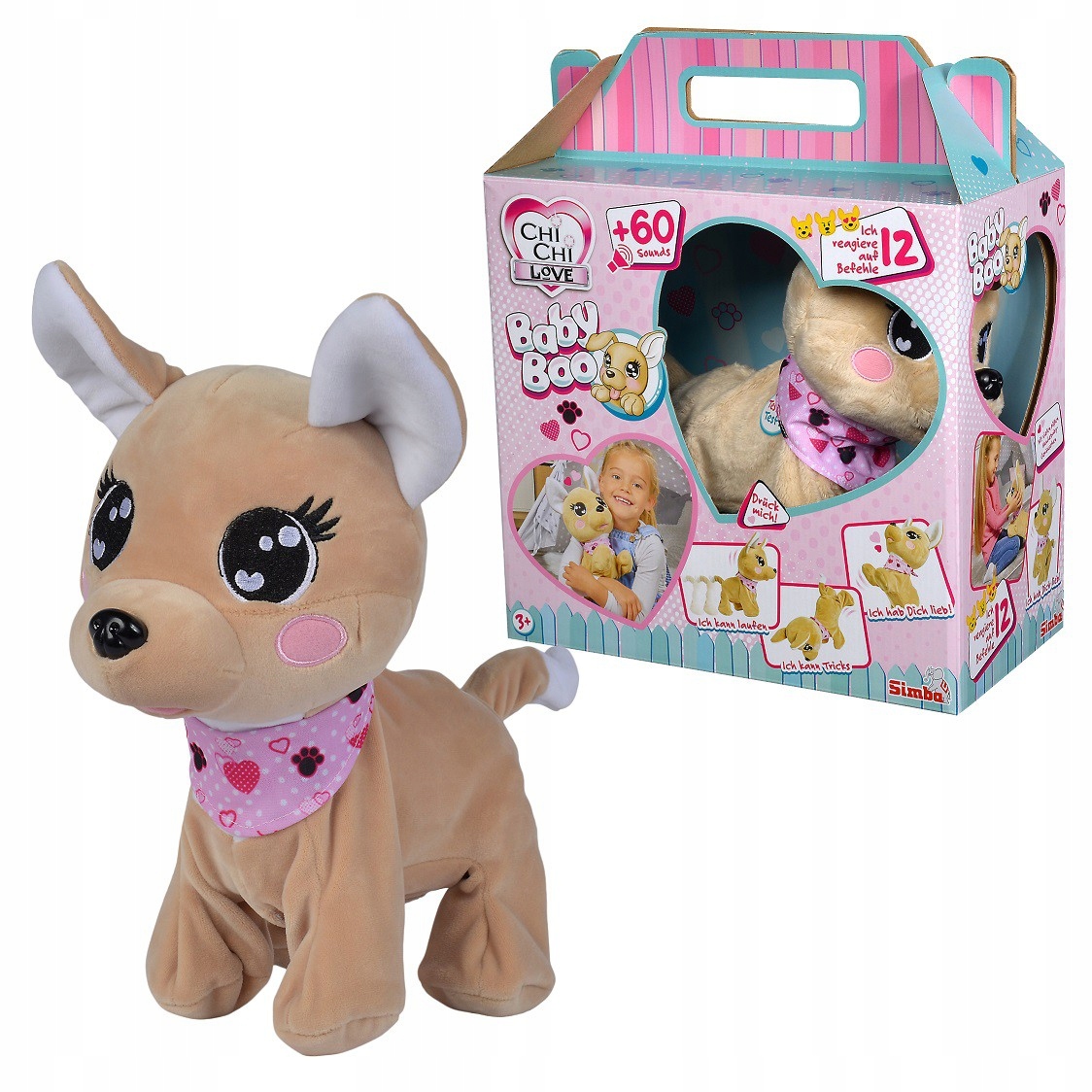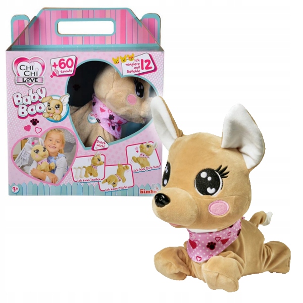 Interaktywny Piesek Baby Boo z serii Chi Chi Love to wspaniały towarzysz zabaw i prawdziwy przyjaciel dzieci. Wystarczy okazać mu odrobinę miłości, zabrać do domu, a na pewno zamieni każdą chwilę w cudowną przygodę. Pluszowy piesek wygląda jak prawdziwy szczeniak Chihuahua, uszyty został z przyjemnego w dotyku pluszu, dlatego przytulanie jego to niezwykła przyjemność. Niewątpliwie uroku dodaje mu różowa chustka z motywem serduszek i psich łapek. Baby Boo reaguje na 12 poleceń i wydaje ponad 60 różnych efektów dźwiękowych jak prawdziwy szczeniak.