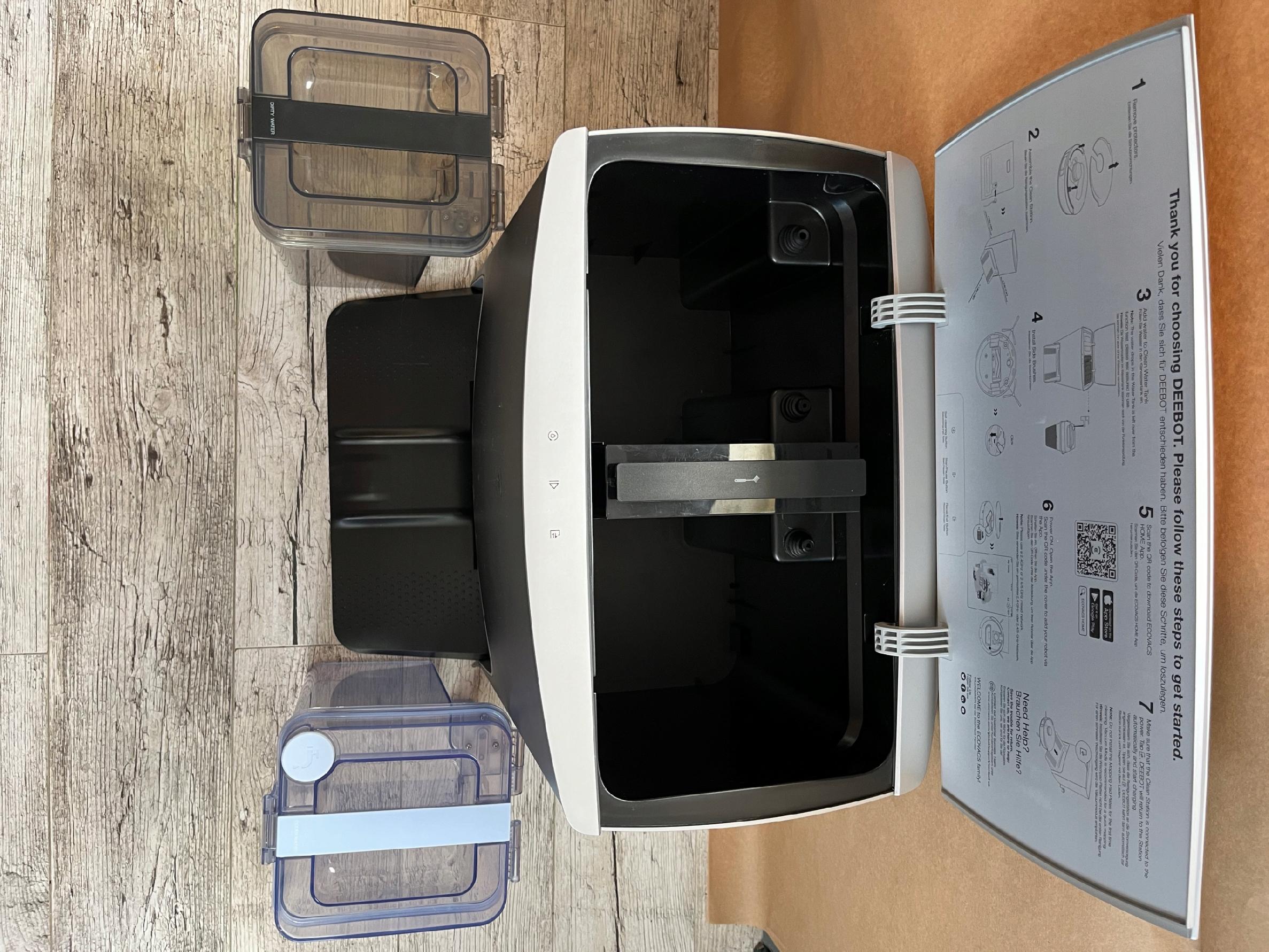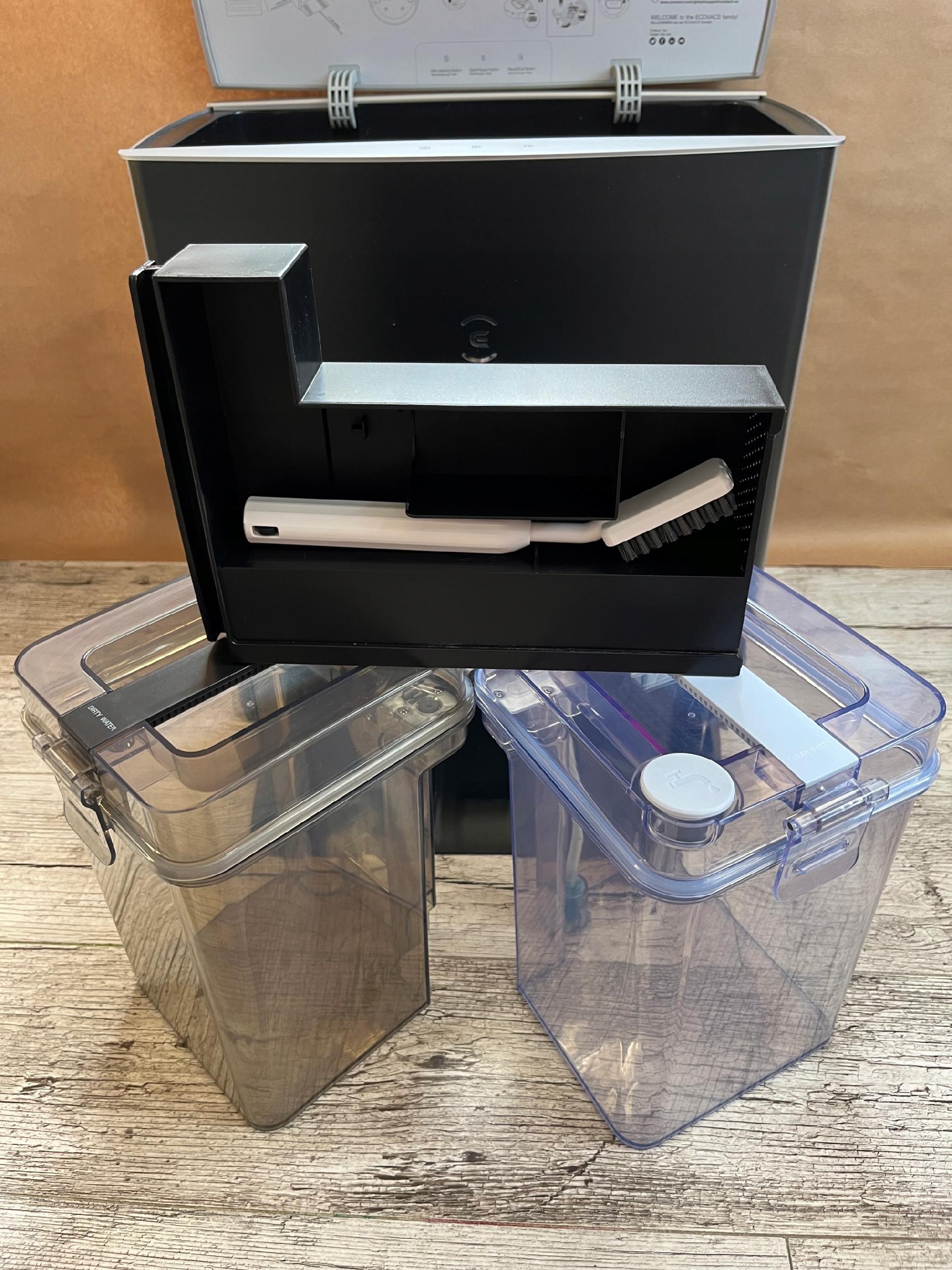 Stacja dokująca ma dwa zbiorniki po 4 litry wody w celu automatycznego płukania mopów – robot wraca co parę metrów kwadratowych do stacji i przemywa sobie mopy. Do tego stacja ma funkcję uzupełniania wody w zbiorniku samego robota (mamy 3 poziomy dozowania wody na szmatki). Ostatnią funkcją stacji jest suszenie szmatek po myciu.