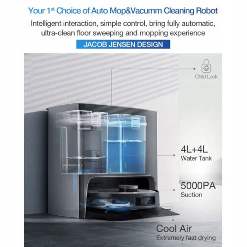 Specyfikacja robota też jest całkiem dobra. Mamy aż 5000 Pa mocy ssania, baterię 5200 mAh pozwalającą na nawet 260 minut pracy, zbiornik na wodę w robocie o pojemności 80 ml, a na kurz 400 ml. Czas ładowania to nawet 6,5 h, a głośność pracy nie przekracza 68 dB. Robot ma 10,3 cm wysokości i rozbudowaną aplikację z masą funkcji.