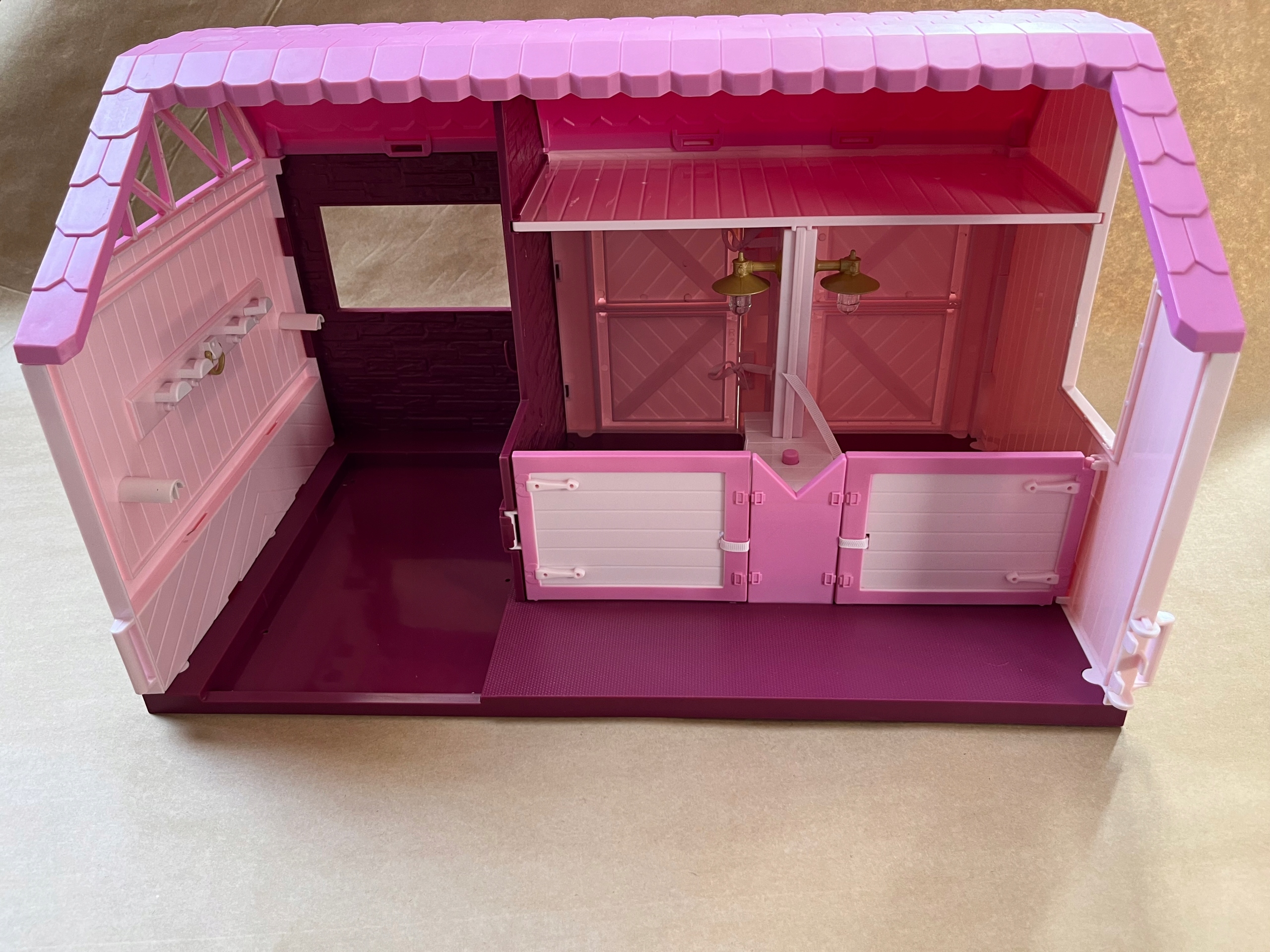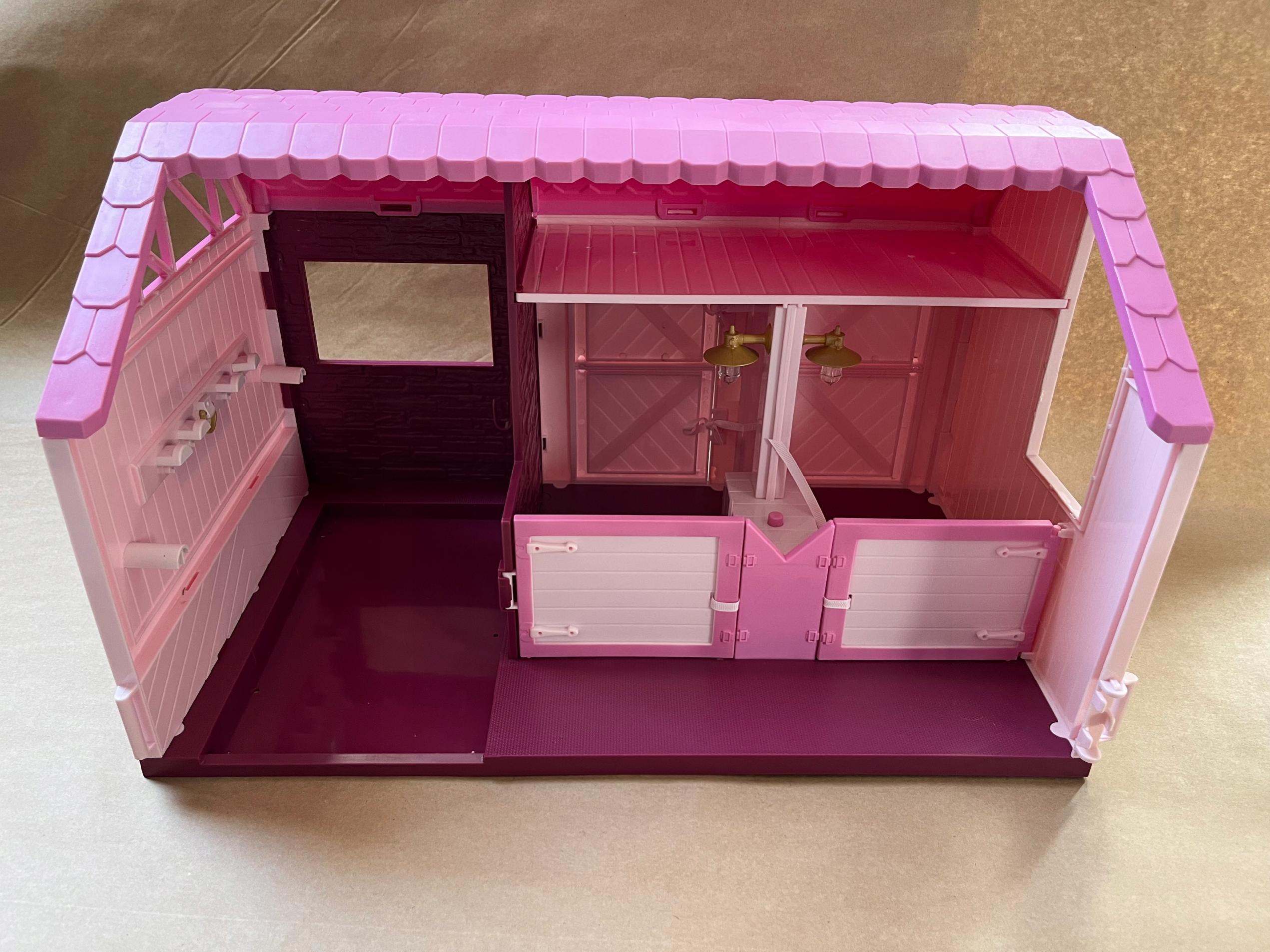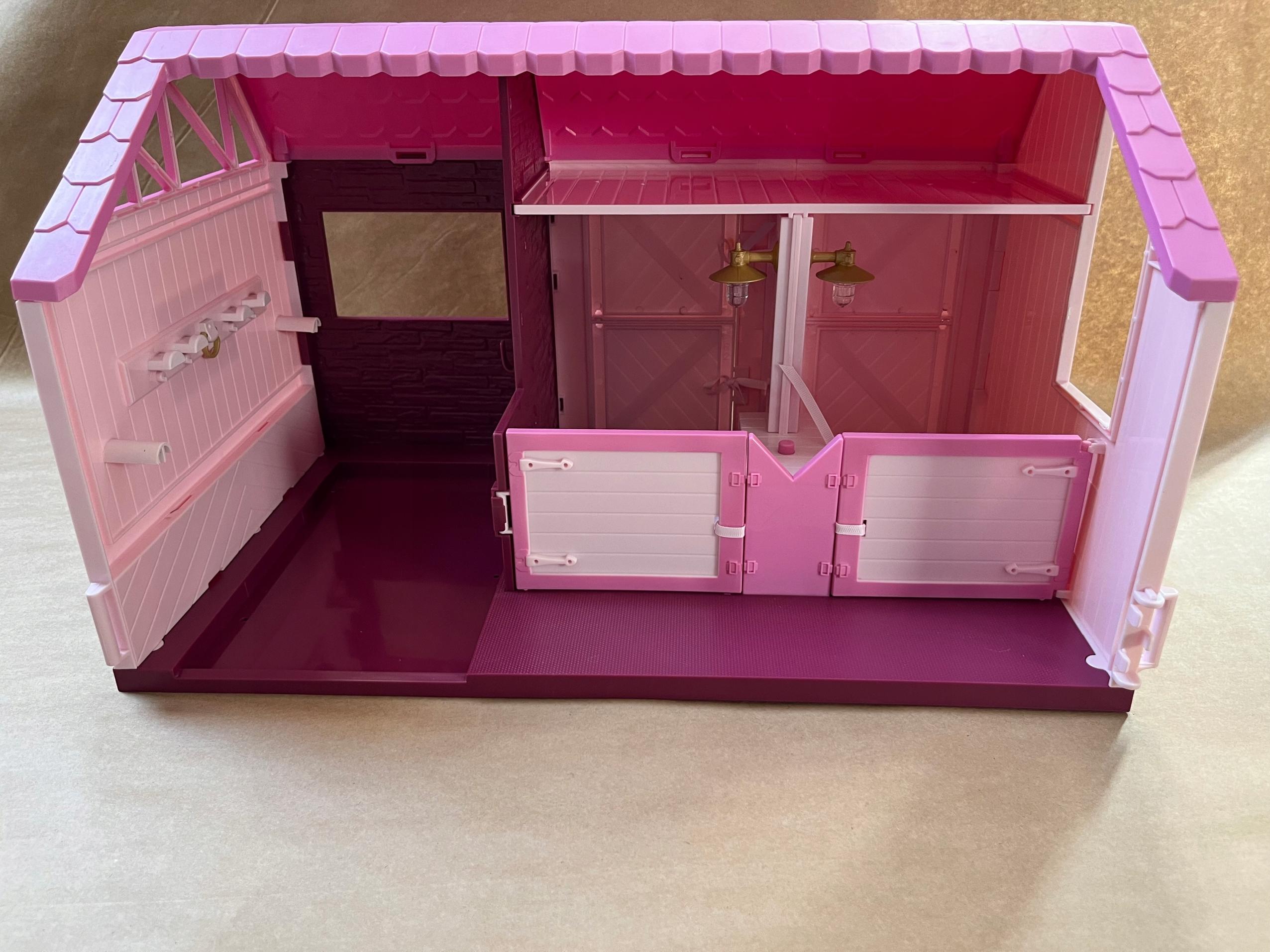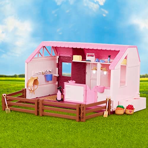 - Bez montażu: Rozpakuj i baw się! Ta stajnia dla koni jest wstępnie zmontowana i jest kompatybilna z większością miniaturowych lalek i koni.