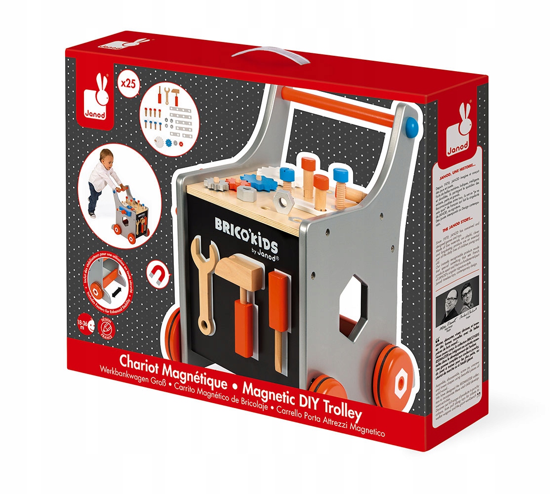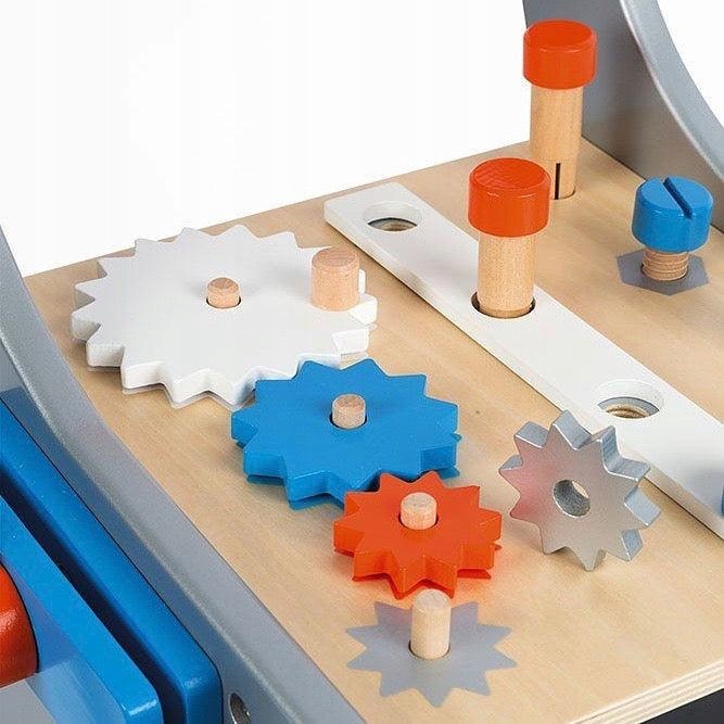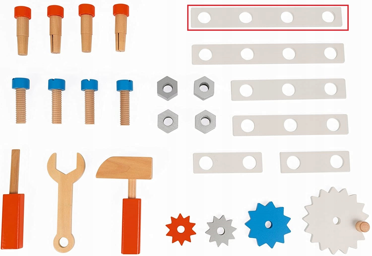 Zestaw zawiera śrubki, gwoździe, nakrętki, koła zębate (po 4 sztuki), listwy (6 sztuk), śrubokręt, klucz i młotek oraz boczne imadło. Narzędzia przyczepiane są do ściany warsztatu za pomocą magnesu. Wózek posiada drewnianą rączkę i warsztat z dolną półką do przechowywania. Jego koła wykończone są gumką, co zapobiega rysowaniu podłogi.