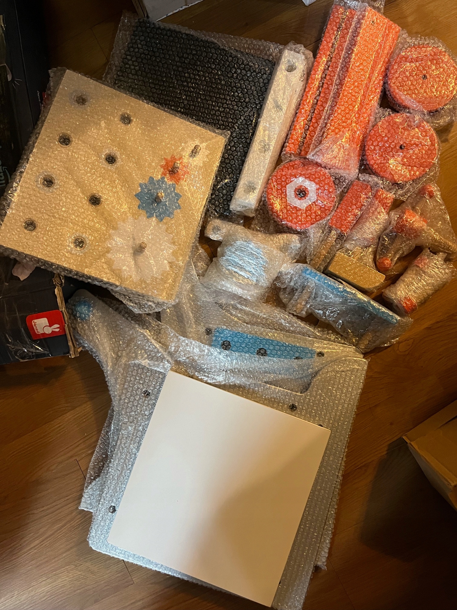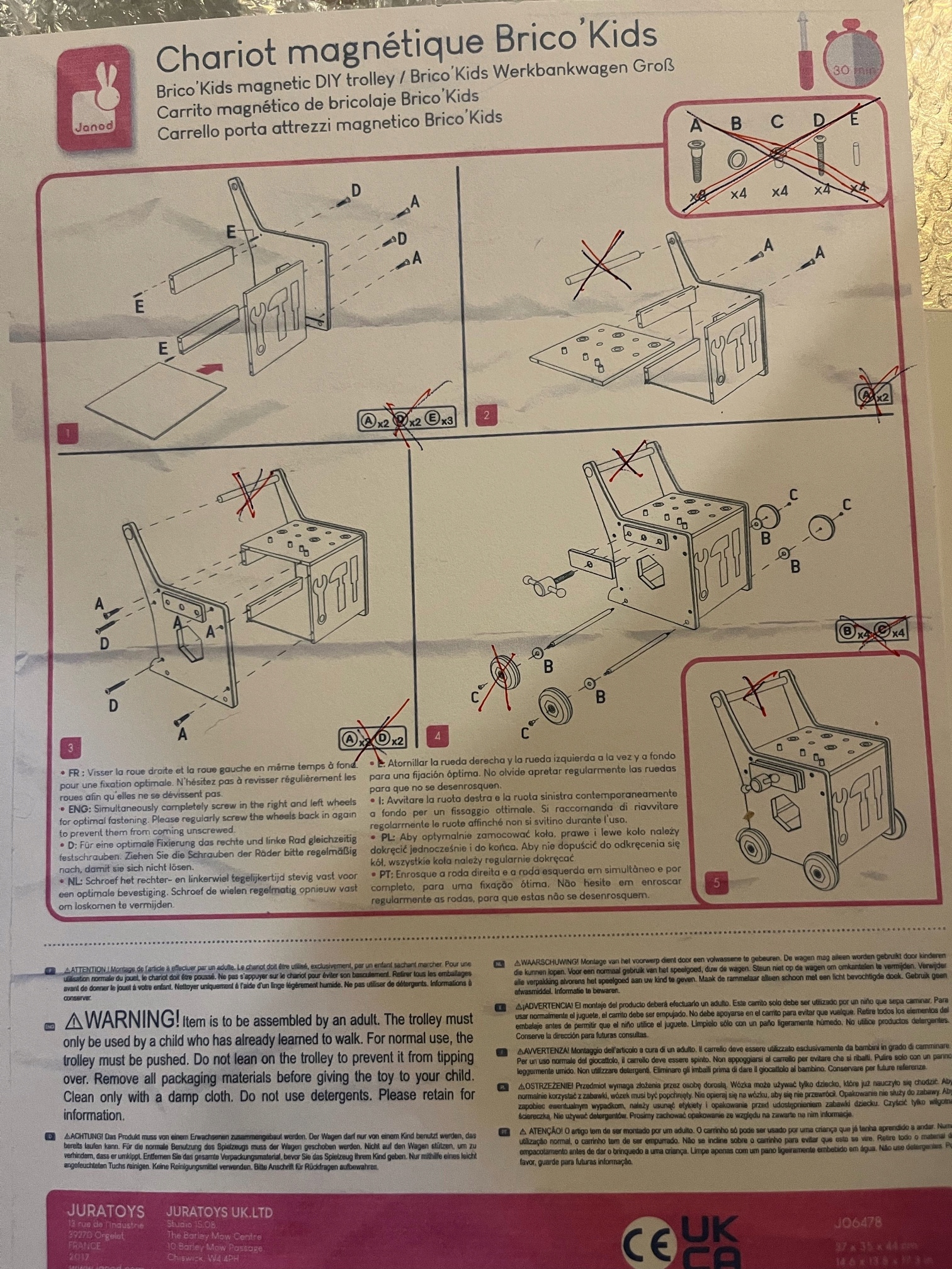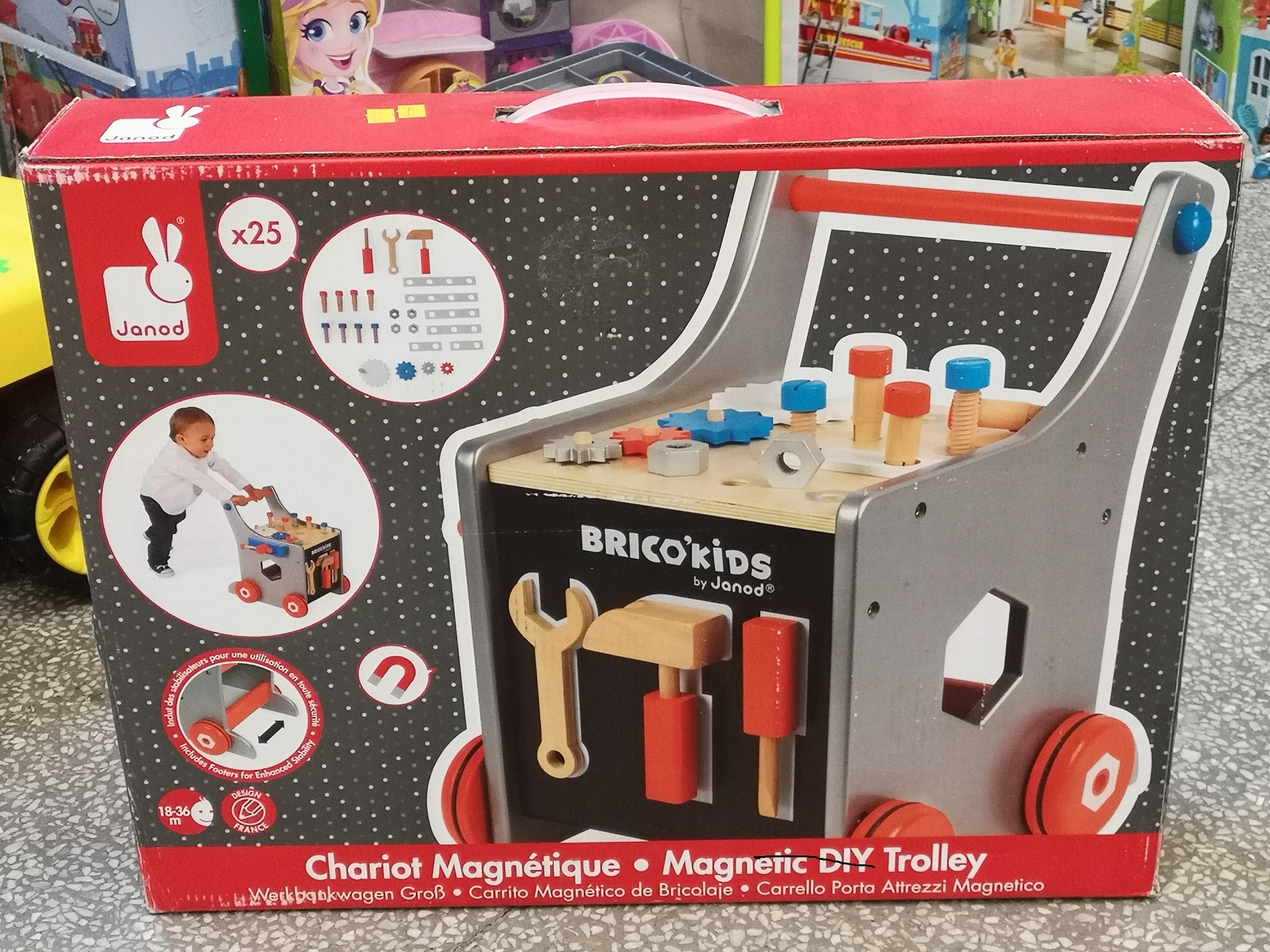 Zestaw zawiera śrubki, gwoździe, nakrętki, koła zębate (po 4 sztuki), listwy (6 sztuk), śrubokręt, klucz i młotek oraz boczne imadło. Narzędzia przyczepiane są do ściany warsztatu za pomocą magnesu. Wózek posiada drewnianą rączkę i warsztat z dolną półką do przechowywania. Jego koła wykończone są gumką, co zapobiega rysowaniu podłogi.